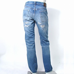 細すぎず太すぎないプレーンなシルエットでバックシルエットに定評のある、定番1101をベースに大胆なダメージを施した一本。ダメージ部分に充てた淡めのフルカウントオリジナルカモフラージュコーデュロイ生地が特徴的。コーデュロイ特有の凹凸やカモ柄が、縦落ちやヒゲと見事に調和する事で、インパクトを残しつつも、さりげなく自然な表情に仕上がっている。シンプルなトップスに映える、大人の為のクラッシュデニム。